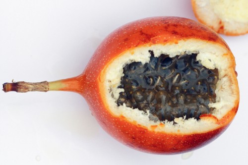 Originally from the Andes Mountains, granadilla is a fruit colored in yellow and orange. The skin is hard and slippery, the black seeds are firm and protected by a transparent gelatinous pulp. This pulp is the edible part of the fruit and tastes sweet. Some say it tastes like chewing gum.