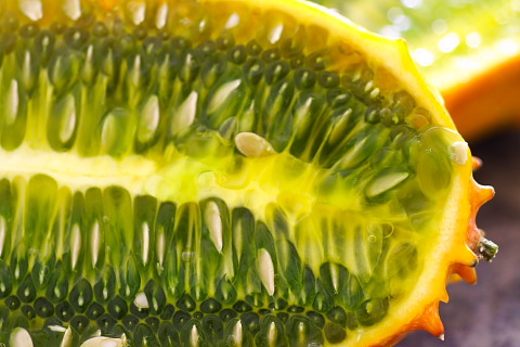 Kiwano is a yellow-orange fruit, native from Africa Kalahari, now being grown in California. It looks like a pumpkin with thorns. Its taste has been compared to a combination of cucumbers and zucchini or bananas, cucumbers and lemons. It is also known as the African cucumber or horned melon.