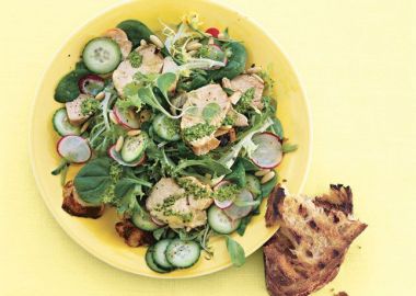 2 pieces of grilled chicken breast, 6-8 tablespoons olive oil, 2 tablespoons finely chopped shallots, 5 tablespoons fresh lemon juice, 4 tablespoons pine nuts, chopped parsley, chopped tarragon, spinach, valerian, lettuce, radishes, finely sliced 1 large cucumber