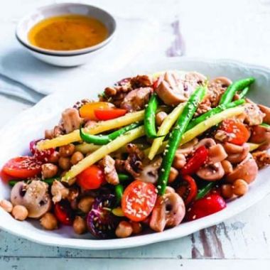 Add green beans, tomatoes and chickpeas in the mushroom bowl. Place remaining dressing over and mix them well. Put everything on a plate, throw over peanuts and sesame seeds. Enjoy!