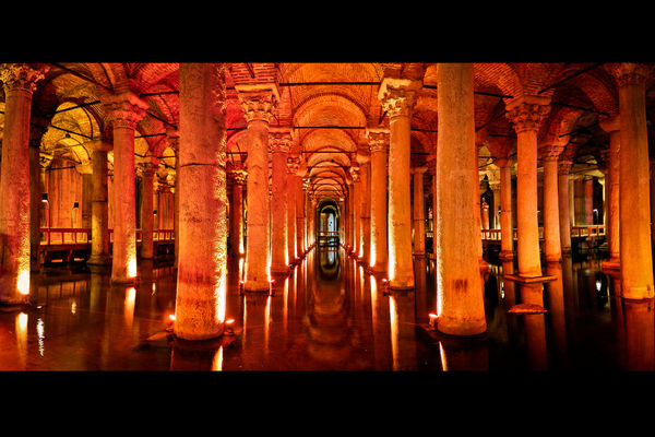 Basilica Cistern, known as the Sunken Palace, is the largest of several hundred ancient cisterns that lie beneath the city of Istanbul. The name comes from a large public square, Stoa Basilica, beneath which it was built. Construction started in 532 years during the reign of Emperor Justinian I in order to collect rainwater and ensure Istanbul city with drinking water.